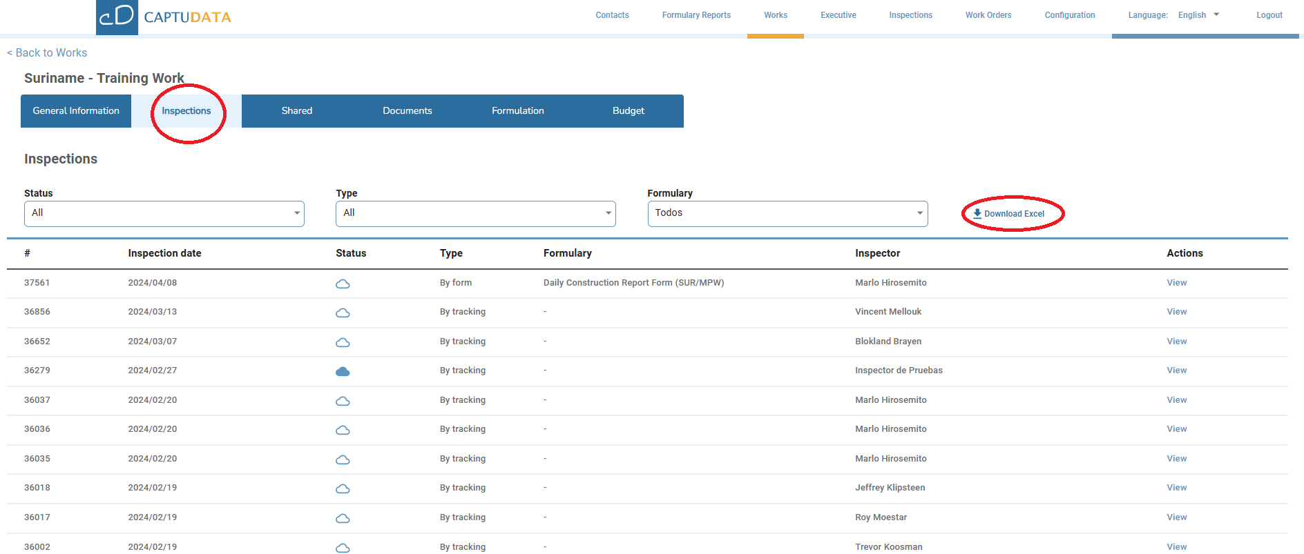 Downloading an Excel file with the general inspection data is very useful for managing or analyzing this information as needed.