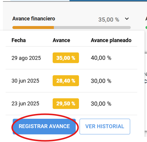 En la vista de detalle, ubica la tarjeta o campo correspondiente al Avance financiero.