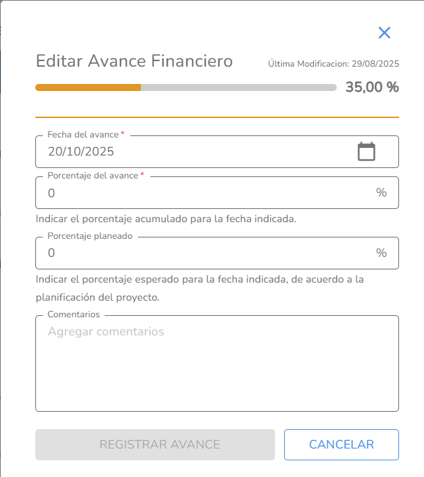 Porcentaje o monto de avance financiero: puedes registrar el avance en porcentaje o en monto monetario.